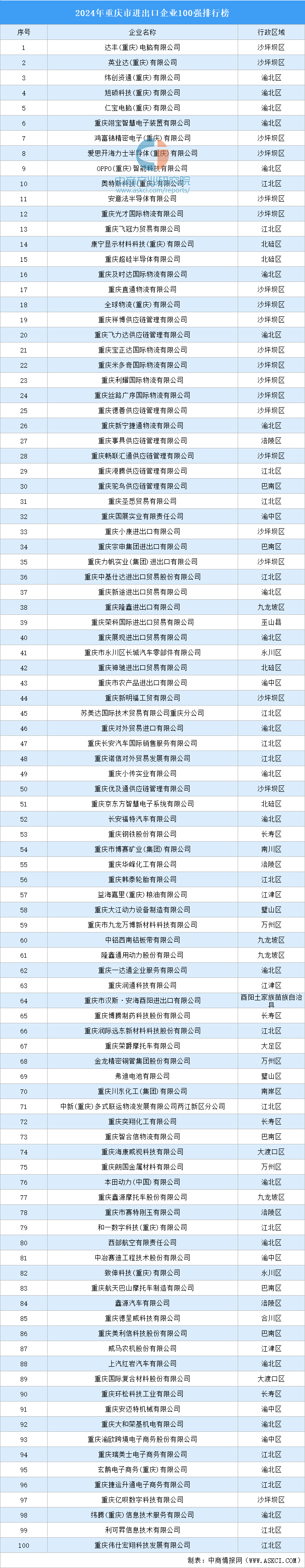 中商谍报网讯:3月13日,进出口商会2024年度会员大会暨“稳增量、提质量”外贸从题勾当举行,进出口企业100强榜单揭晓,达丰电脑无限公司等100家企业上榜。进出口企业100强企业中,渝北区、沙坪坝区各上榜企业100家企业,江北区16家企业上榜,巴南区各5家企业上榜。