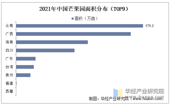 中国芒果产区次要分布正在云南、广西、海南、四川、广东、、贵州等地,此中,云南、广西、海南以及四川产区的芒果园面积较着跨越其他产区。2021年云南、广西、158。4万亩、99。3万亩、80。7万亩,正在全国芒果园面积中所占的比沉顺次为29。87%、27。01%、16。93%、13。76%。