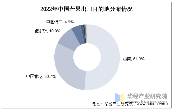我国芒果次要出口至越南、中国、中国澳门和新加坡等地,此中出口至越南和中国的数量跨越了1万吨,别离为1。93万吨和1。16万吨,占比别离为51。3%和30。7%。