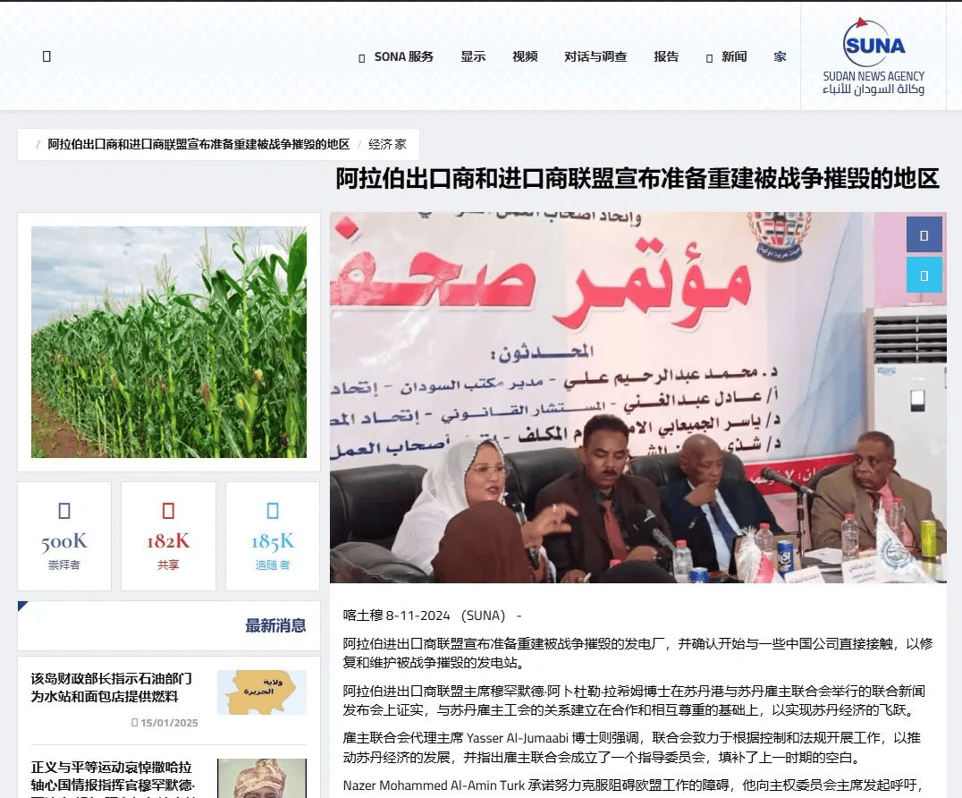 2024年11月8日,并已取中国公司联系修复受损电坐。取苏丹雇从结合汇合做旨正在推进苏丹经济成长。旧事担任人舒达·谢里夫,阿拉伯进出口商结合会也将努力于消弭工做妨碍,鞭策苏丹经济苏醒。