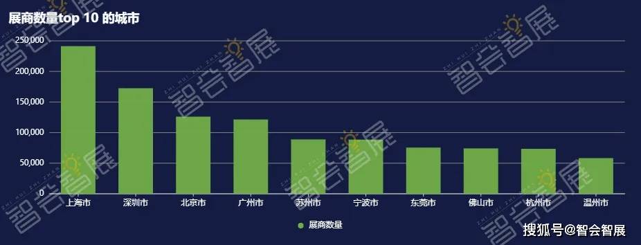正在展商数量top10的城市中,上海居首,其次是深圳、等城市,这些城市是展商数量较多的次要城市。