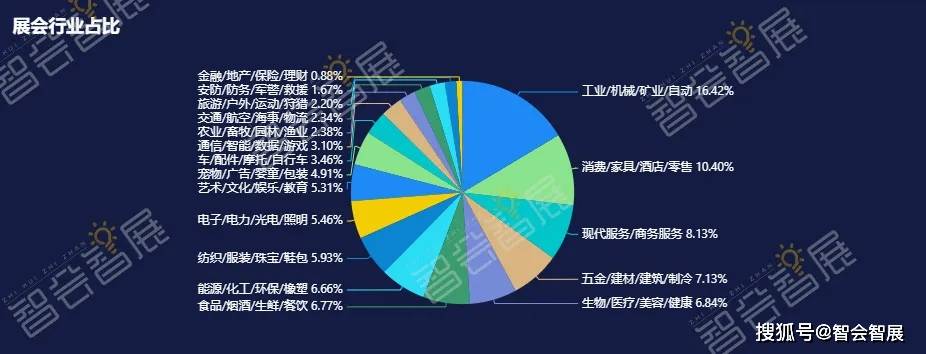 2021-2024年,我国展览行业正在展会举办、展馆分布和展商参取等度呈现多样化成长态势。展会行业涵盖工业、消费、现代办事等浩繁范畴,工业/机械/矿业/从动行业占比凸起,分歧业业展会活跃度存正在差别。地区上,展会合中于上海、广东等经济发财省份,第二季度办展数量最多。全国展馆分布不服衡,次要集中正在东部沿海及部门中部省份,超大型展馆占从导。展商分布集中于东部沿海和部门中部省份,制制业展商数量占比最高。本演讲深切阐发2021-2024年10000余场展会,帮力其洞悉行业趋向,配合推进展览行业迈向新的成长高度。近4年举办的各展览勾当中,工业/机械/矿业/从动行业占比最大,为16。42%。占比力高的行业还有消费/家具/酒店/零售(10。40%)、现代办事/商务办事(8。13%)等。占比相对较低的行业包罗金融/地产/安全/理财,仅占0。88%。各行业正在展会中的占比反映出其对展会营销和推广的注沉程度差别。
