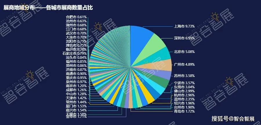 正在各城市展商数量占比中,上海市占比最高,为9。73%,其次是深圳市(6。95%)和市(5。08%)。