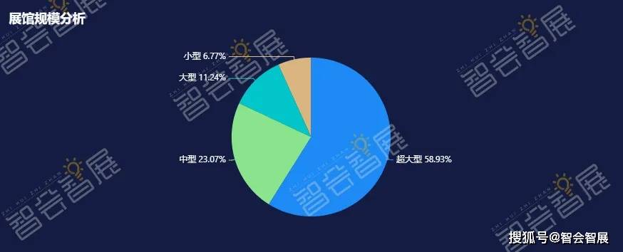 超大型展馆占从导。正在展馆规模方面,超大型展馆占比最高,为58。93%,表白正在全国范畴内,大型展馆设备较为遍及,可以或许满脚大型展会的需求。中型展馆占比23。07%,大型展馆占比11。24%,小型展馆占比最低,为6。77%。