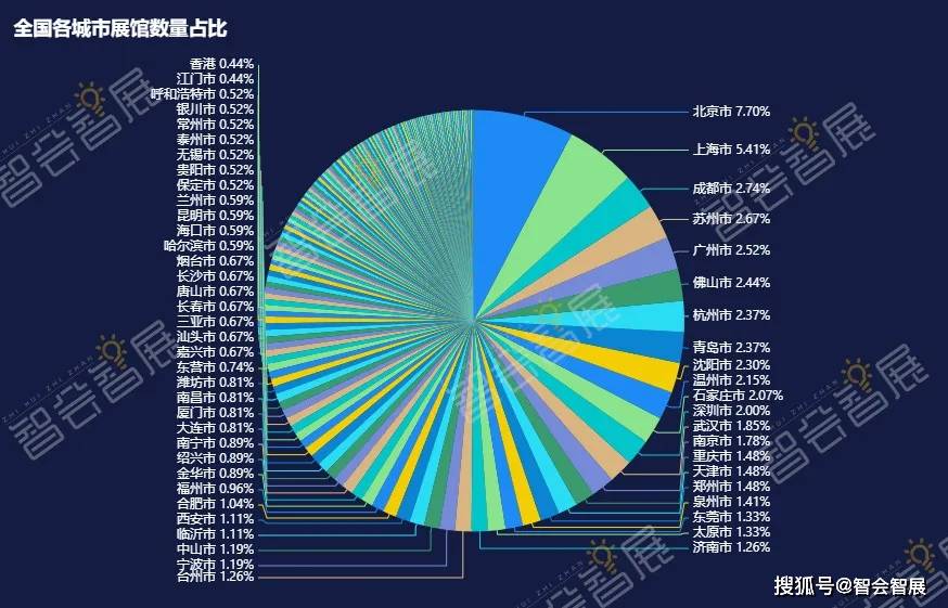 展馆数量正在城市间分布不服衡。市的展馆数量占比最高,为7。70%,其次是上海市,占比5。41%,成都会占比2。74%。这些城市正在展馆数量上处于领先地位。、江门市、等城市的展馆数量占比相对较少,均正在0。52%以下。