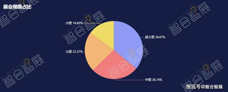 超大型展会(展览面积大于10万平米)占比36。07%,正在展会规模中占领从导地位。大型展会(展览面积大于5万平米小于10万平米)占比22。37%,小型展会(展览面积小于等于2万平米)占比最低,为14。83%。