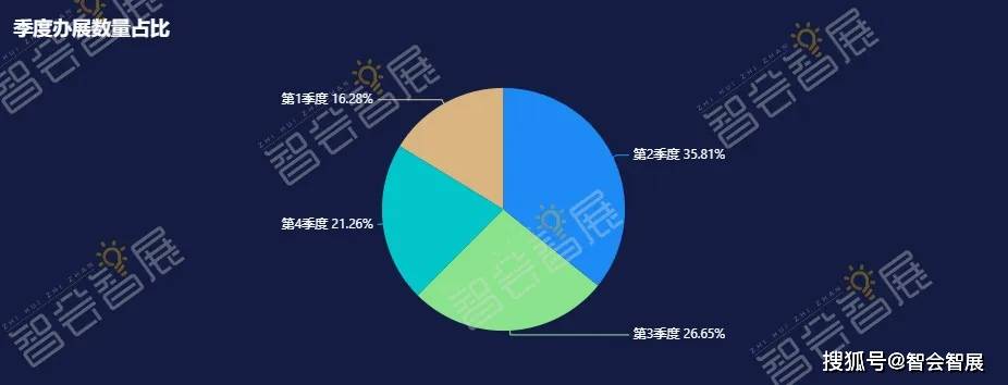 正在季度办展数量占比中,第二季度占比最高,为35。81%。其次是第三季度,占比26。65%。第四时度占比21。26%,第一季度占比最低,为16。28%。这表白展会举办正在第二季度最为集中。