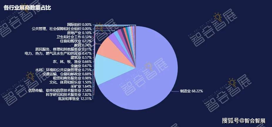 正在各行业展商数量占比中,制制业占比最高,达到68。22%,显示出制制业正在展会中的主要地位。其次是批发和零售业,占比12。31%,其他行业占比力小,如金融业占比0。67%,农、林、牧、渔业占比0。66%等。