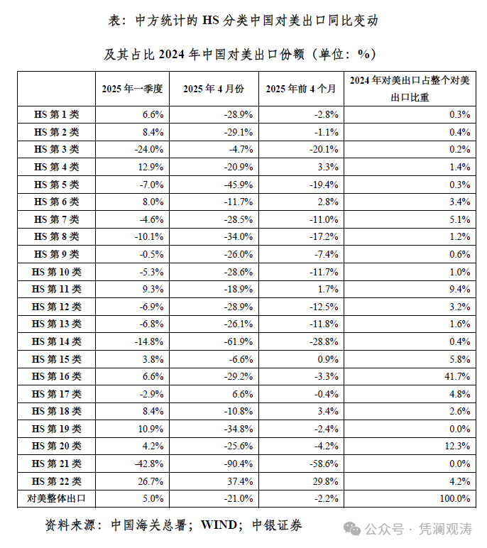 从海关统计的HS分类看,22大类商品中,2025年4月,中国对美出口同比降幅高于对美全体出口降幅的有14大类,其出口额合计占到了2024年中国对美出口总额的68。1%。此中,HS第5类“矿产物”、第14类“珠宝、贵金属及成品;仿首饰;硬币”和第21类“艺术品、珍藏品及古物”的降幅都正在40%以上,别离下降45。9%、61。9%和90。4%,可称之为塌体例下滑,但合计仅占到2024年中国对美出口总额的0。7%。当月,中国对美出口削减,次要是受累于HS第16类“机电、音像设备及其零件、附件”出口下降29。2%,该类商品占到2024年中国对美出口总额的41。7%,为中国对美第一大品类的出口(见下表)。