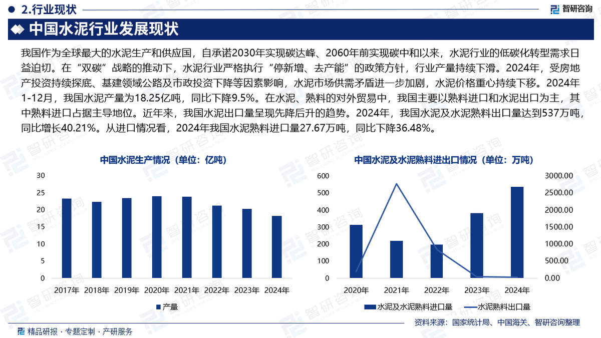 做为一个了中国低碳水泥多年成长的专业机构,智研征询但愿可以或许取所有努力于取低碳水泥行业企业联袂共进,供给更多无效消息、专业征询取个性化定制的行业处理方案,为行业的成长尽绵薄之力。1:本演讲焦点数据更新至2024年12月,少量涉及全球及相关地域数据。2:除一手调研消息和数据外,国度统计局、中国海关、行业协会、上市公司公开演讲(招股仿单、让渡仿单、年报、问询演讲等)等权势巨子数据源亦配合形成本演讲的数据来历。一手材料来历于研究团队对行业内沉点企业获取的一手消息数据,次要采访对象有企业高管、行业专家、手艺担任人、下旅客户、分销商、代办署理商、经销商以及上逛原料供应商等;二手材料来历次要包罗全球范畴相关行业旧事、公司年报、非盈利性组织、行业协会、机构及第三方数据库等。3:演讲焦点数据基于智研团队严酷的数据采集、筛选、加工、阐发系统以及自从测算模子,确保统计数据的精确靠得住。4:本演讲所采用的数据均来自合规渠道,阐发逻辑基于智研团队的专业理解,清晰精确地反映了阐发师的研究概念。智研征询做为中国财产征询范畴带领品牌,以“用消息驱动财产成长,为企业投资决策赋能”为品牌。公司融合定量阐发取定性阐发方式,用自从研发算法,连系行业交叉大数据,通过多元化阐发,分解定性内容背后逻辑,客不雅实正在地阐述行业现状,审慎地预测行业将来成长趋向,为客户供给专业的行业阐发、市场研究、数据洞察、计谋征询及相关处理方案,帮力客户提拔认知程度、盈利能力和分析合作力。次要办事包含精操行研演讲、专项定制、月度专题、可研演讲、贸易打算书、财产规划等。供给周报/月报/季报/年报等按期演讲和定制数据,内容涵盖政策监测、企业动态、行业数据、产物价钱变化、投融资概览、市场机缘及风险阐发等。