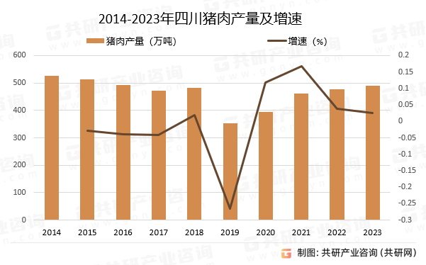 近年来,四川生猪产能强大且不变,出栏量常年领先全国,是独一的国度优良商品猪计谋保障。2023年,四川省出产猪肉489。7万吨,四川猪肉产量正在全国猪肉产量中所占的比沉约为8。45%,全国排名第一,取2014年比拟,猪肉产量削减了37。5万吨、降幅约为7。11%。
