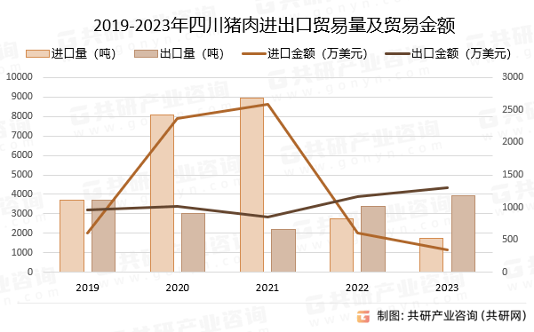 2023年,四川猪肉出口量为3936。02吨、进口量为1741。86吨,净出口量为2194。16吨;取进出口商业量变化趋向相婚配,2019年、2022~2023年,四川猪肉进出口商业金额呈顺差态势,添加了598。97万美元,增幅约为167。48%。