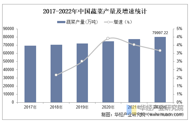 近年来,我国蔬菜产量呈稳健增加的态势,2022年中国蔬菜产量为79997。22万吨,同比增加3。16%。