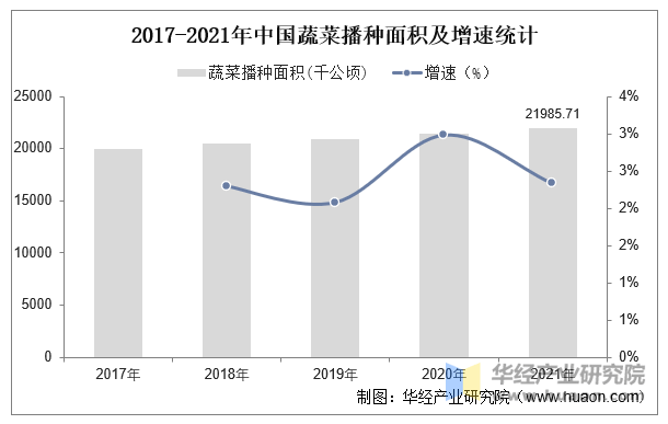 从播种面积来看,我国的蔬菜播种面积正正在逐年增加。数据显示,2021年中国蔬菜播种面积为21985。71千公顷,较上年增加了2。33%。