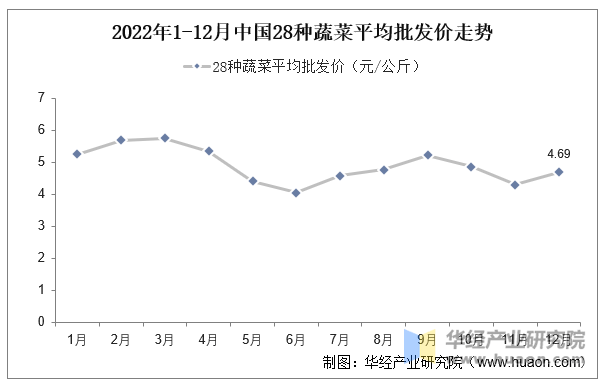 分月度来看,2022年农业农村部监测的 28 种蔬菜全国平均批发价于3月达到峰值,为5。75元/公斤,全年的价钱波动较大。此外,2022年12月,我国28种蔬菜平均批发价为4。69元/公斤。