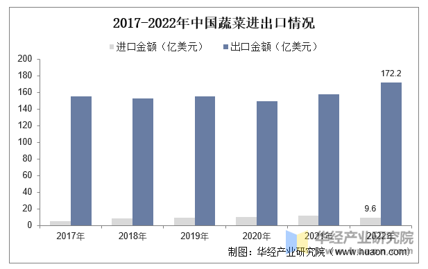 2022年,中国蔬菜出口额为172。2亿美元,同比增加9。2%;进口额是9。6亿美元,同比下降19。0%。商业顺为差162。6亿美元,同比增加1。5%。